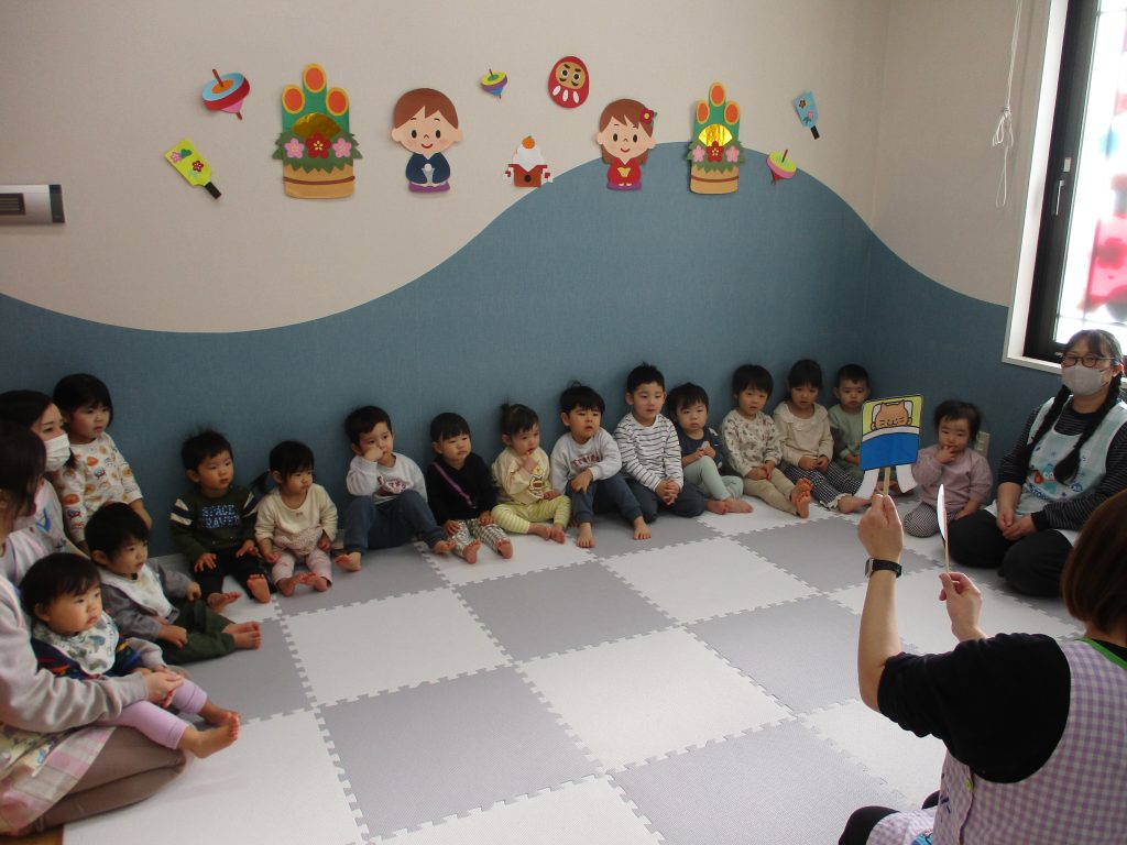 ペープサート『ネコくんの初夢』ではネコくんが凧に乗って空を飛ぶと「すごい!」「とんでるね!」と言いながら見ていた子どもたち😊正月あそびは、コマ回し・うまスキー・福笑い・馬レースのコーナーがありみんな好きなコーナーで楽しくあそんでいましたよ🎵馬レースではお面をつけ「ひひ~ん!!」と馬になりきる姿が可愛らしかったです🐎💗